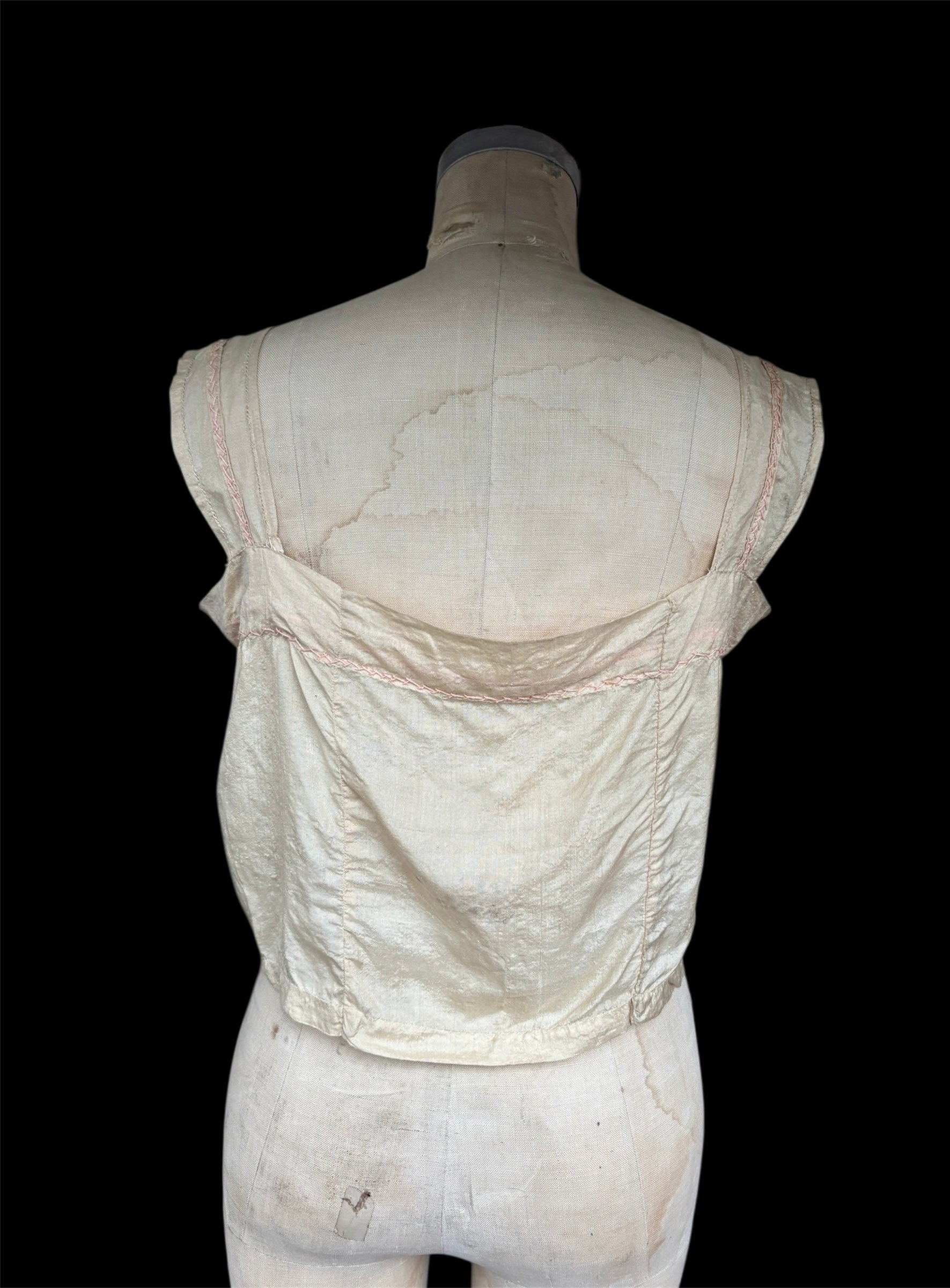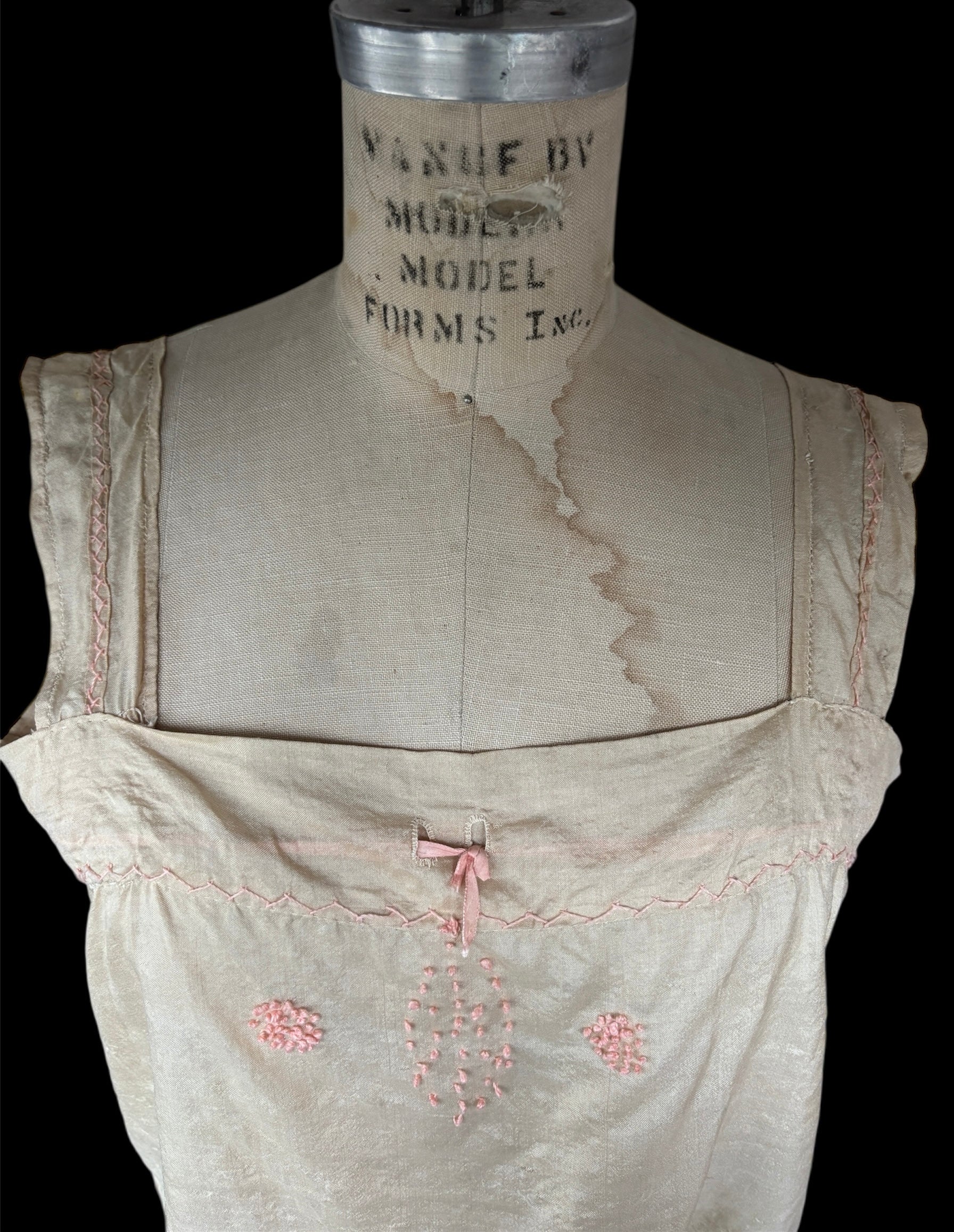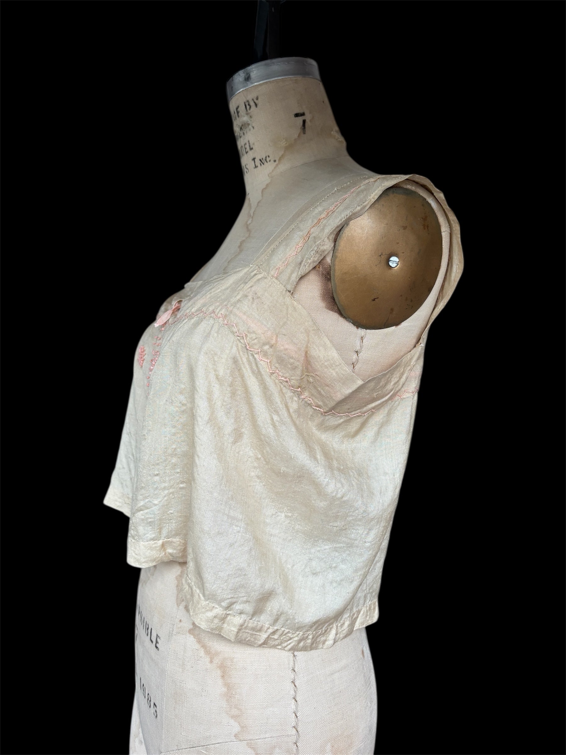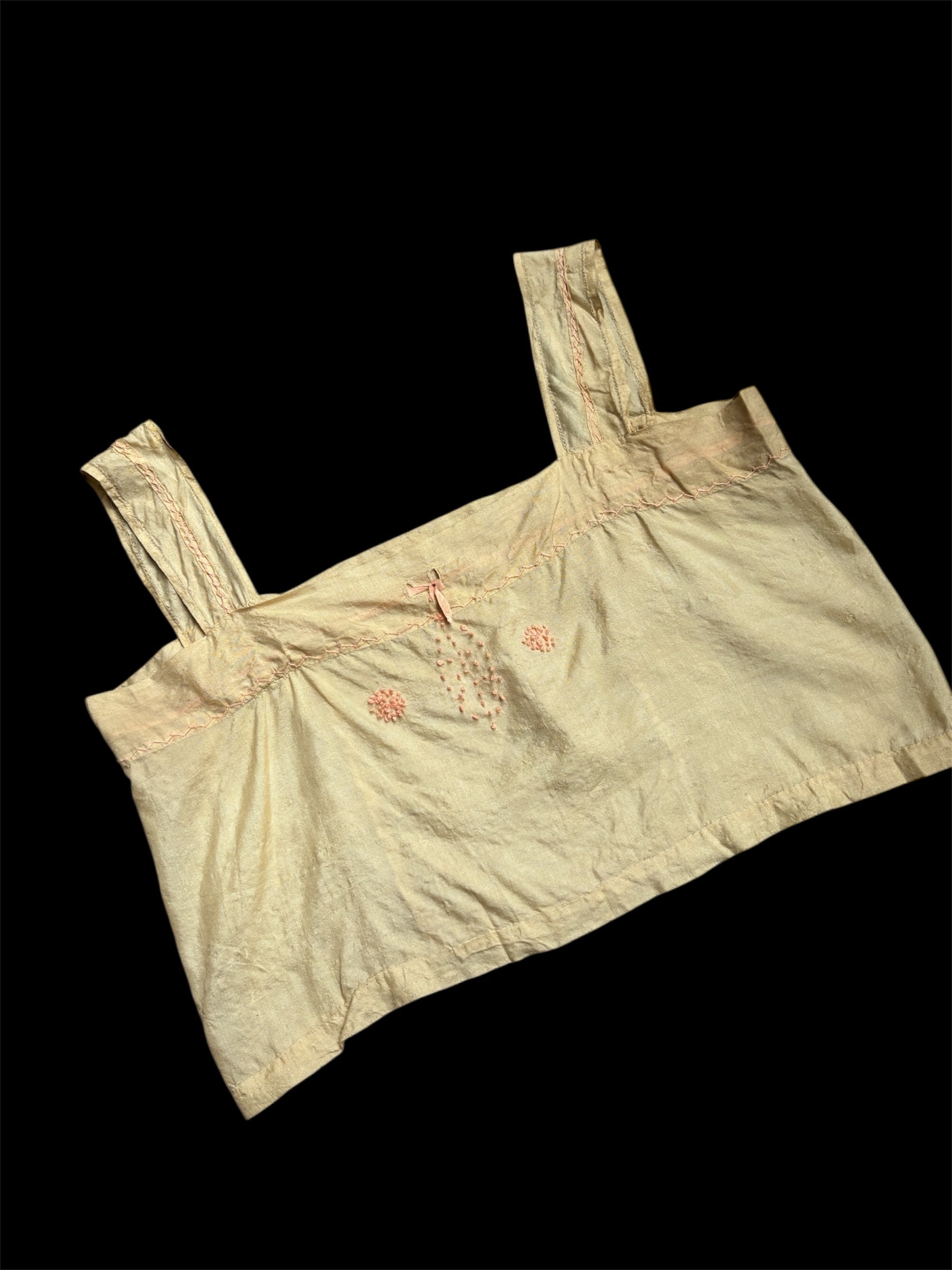 1920s pongee silk corset cover with pink French knots and decorative embroidery. The color is cream and is most accurately portrayed in the flat lay photos. Condition is good for age, has pulls and thin areas throughout. Some light staining as shown. Can fit a variety of sizes, shown on a size S mannequin. Ribbon can be adjusted.