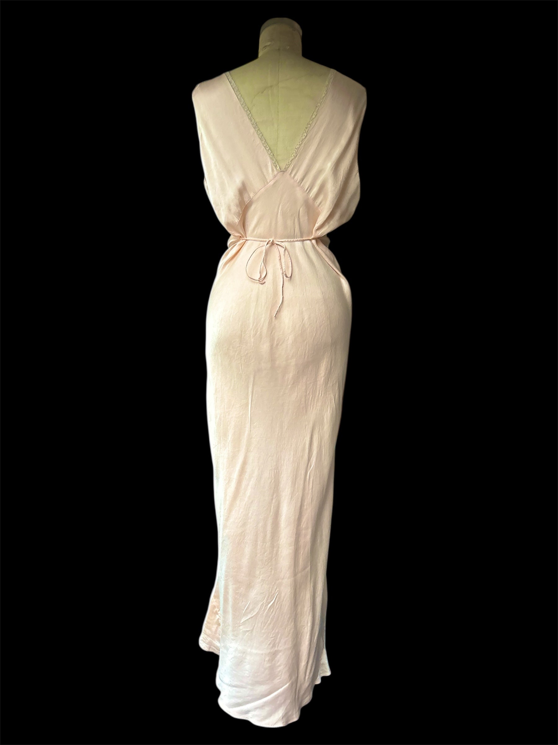 Gorgeous 1930s empire waist pink rayon satin slip dress with a keyhole detail and lace appliqué. Labeled a size 40. Fits like a modern M/L but can be tied to accommodate smaller sizes. Shown on a size S mannequin. In very good vintage condition, just missing a small piece of lace on the front as shown (see last photo).