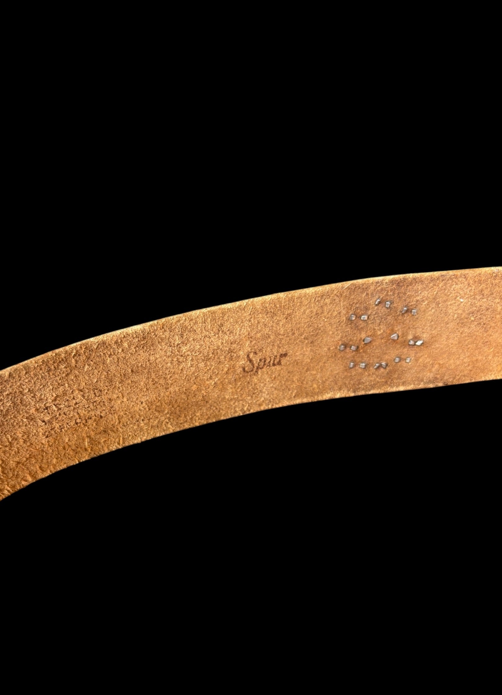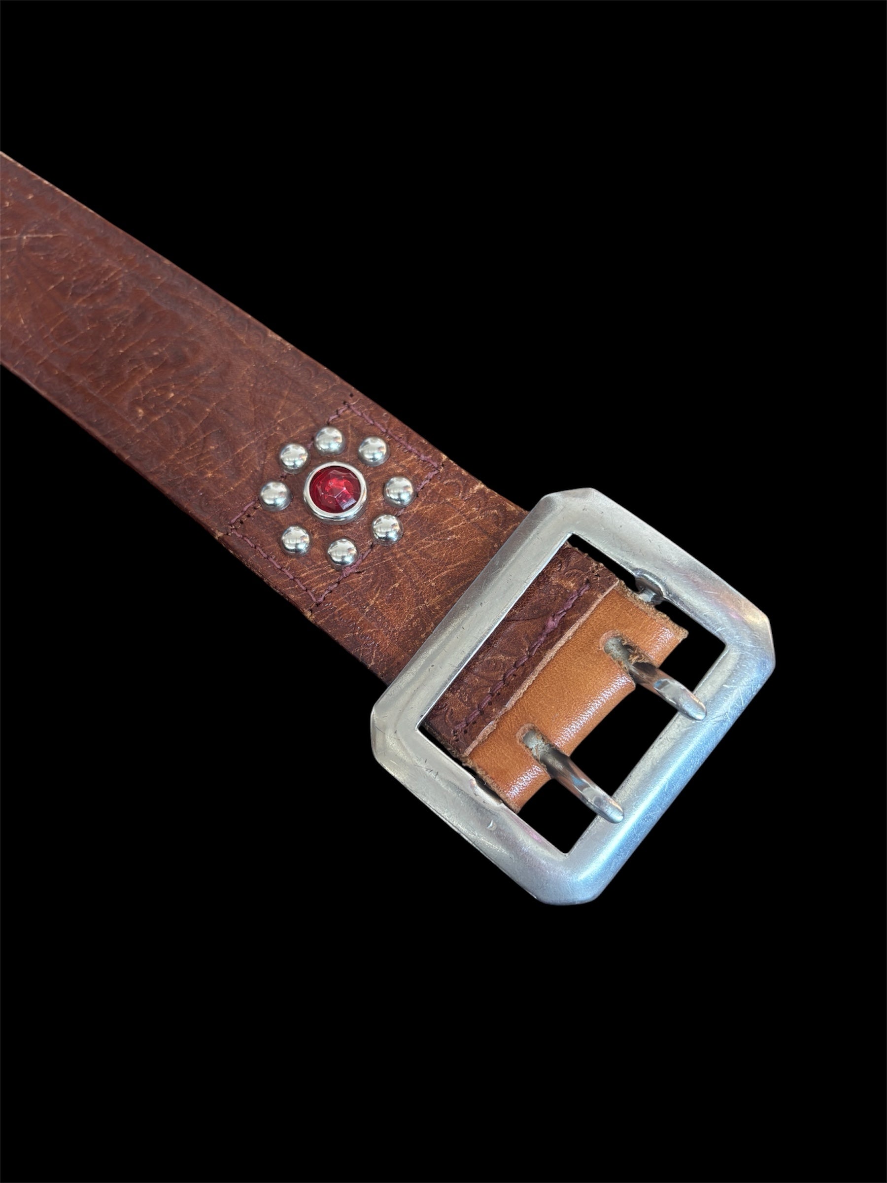 1950s studded and jeweled tooled biker/western style leather belt by Spur. Leather around buckle was reinforced at some point as shown. The repair is hidden when worn. In good vintage condition aside from some superficial cracking.