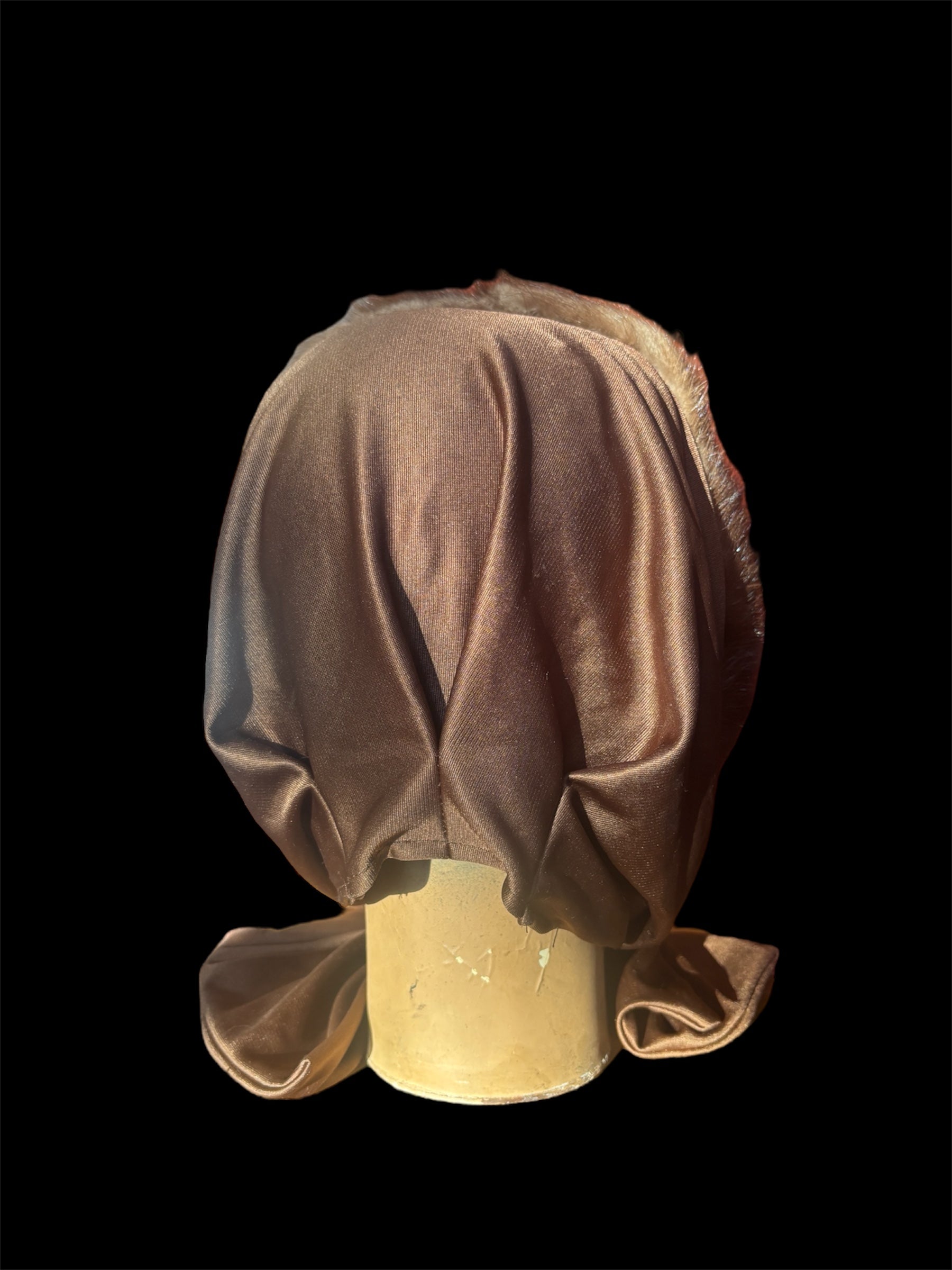 1960s bonnet with attached scarf ties. Nylon with mink trim. No stretch. Has some runs and snags on the inner edge of one of the ties. In overall good vintage condition.