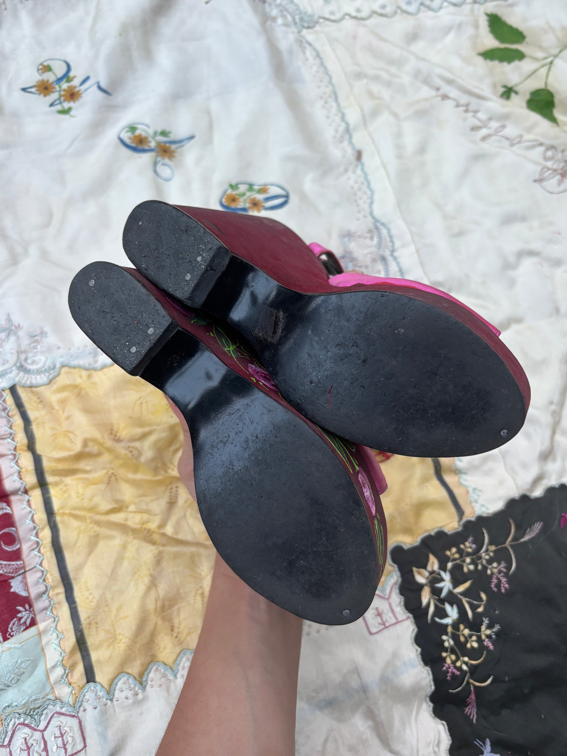 1970s iconic Wonder Wedge mega platforms by Bonnie Smith for Kimel. Hand painted roses on velour with a luxurious satin upper. These have a very 1940s look to them with the peep toe. There is some scuffing and the material at the seam if beginning to lift on one shoe. Elastic at the buckle is still good. In strong and wearable condition. The original owner told me these shoes have seen many a 1970s night club!