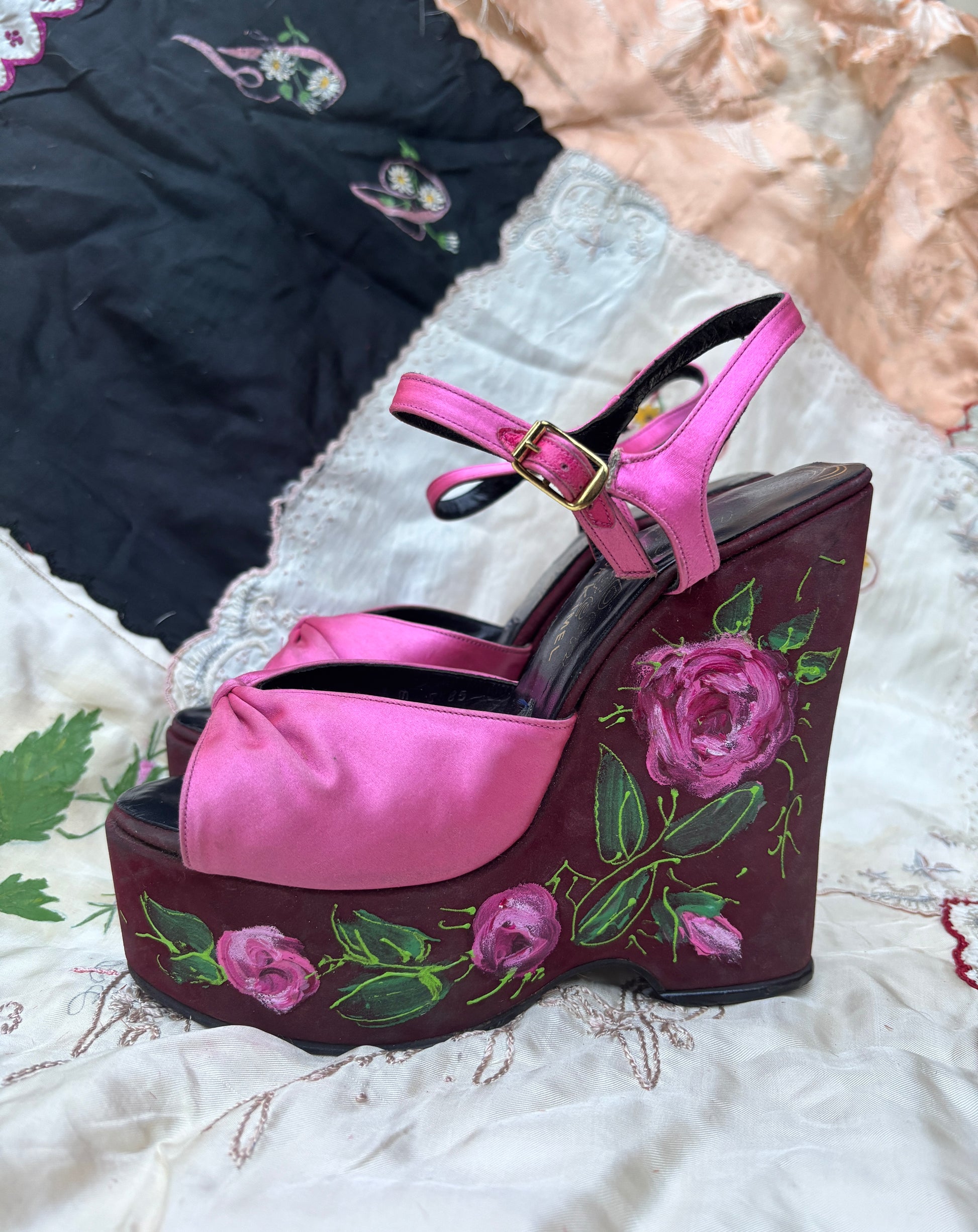 1970s Wonder Wedge by Bonnie Smith hand painted rose platforms