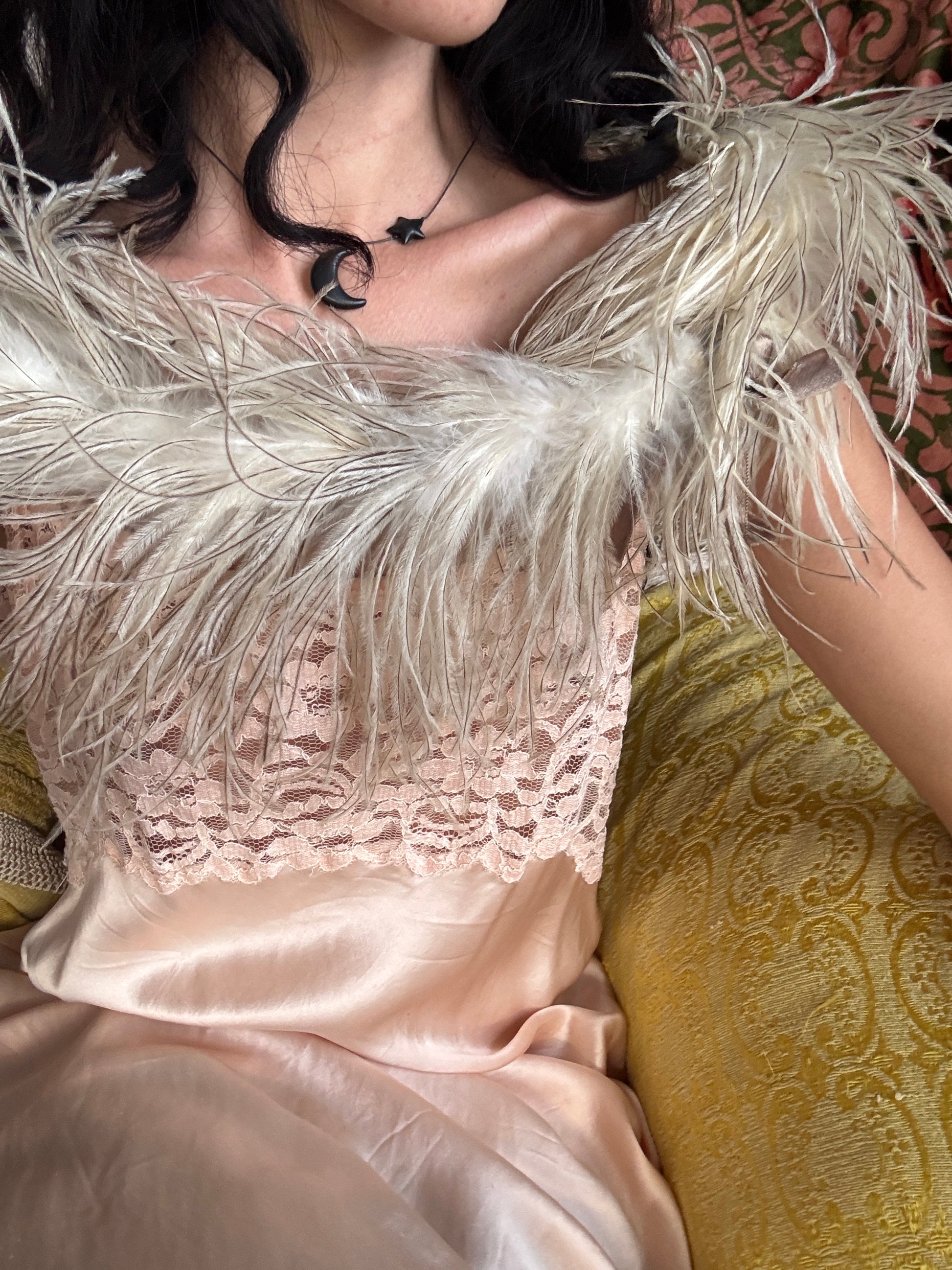 Old Hollywood vintage ostrich feather boa that can be worn as a capelet when clasped. Would complete any evening look! Adorned with a velvet bow at closure. In excellent condition.