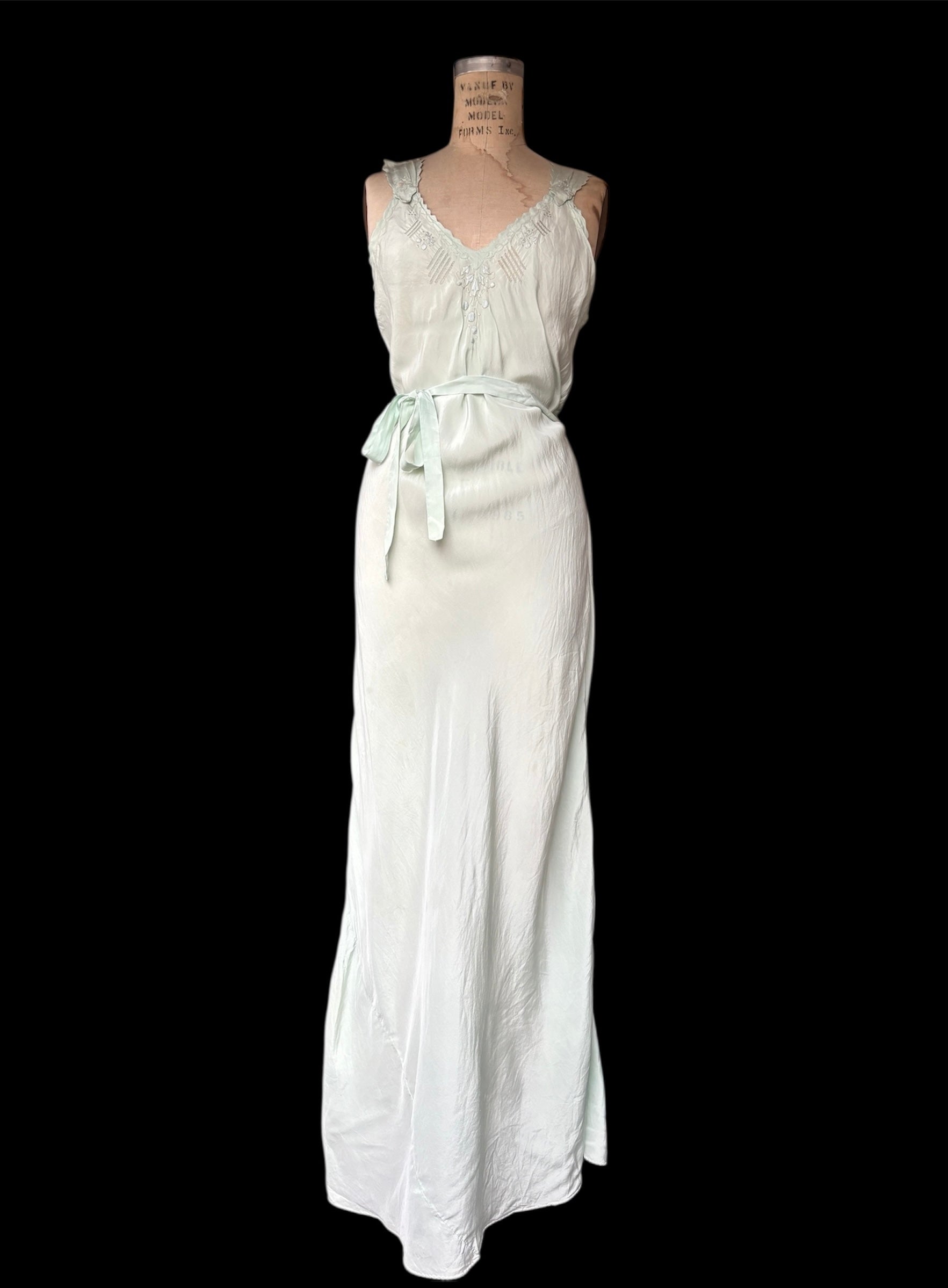 1930s silk/rayon blend bias slip dress in the most ethereal seafoam color. Cutwork, appliqué and embroidery adorn the neckline and has a beautiful scalloped edge. In very good vintage condition, missing one belt loop but doesn’t affect wearability. Labeled size 36. Fits like a S/M and can be tied to fit smaller.