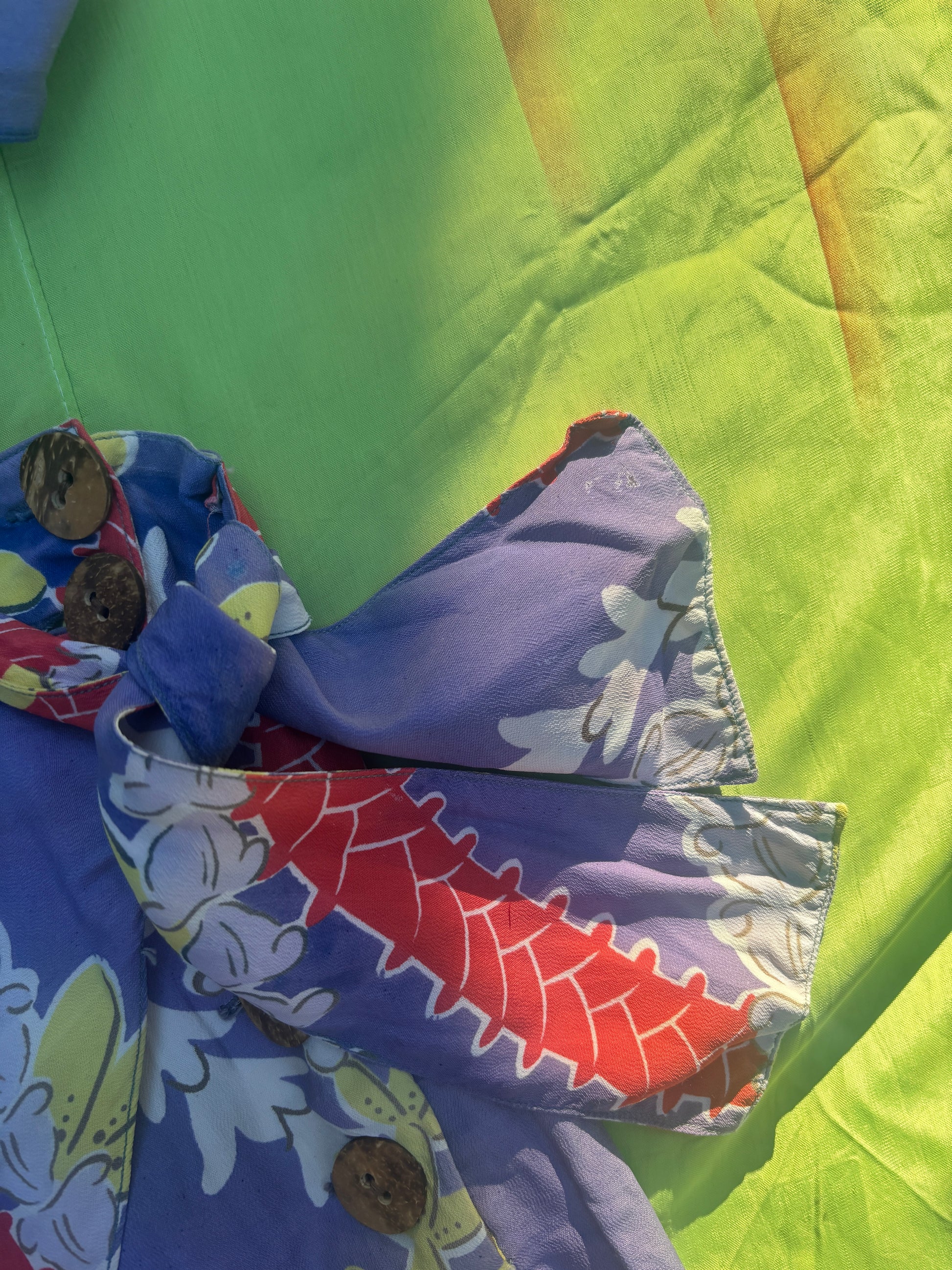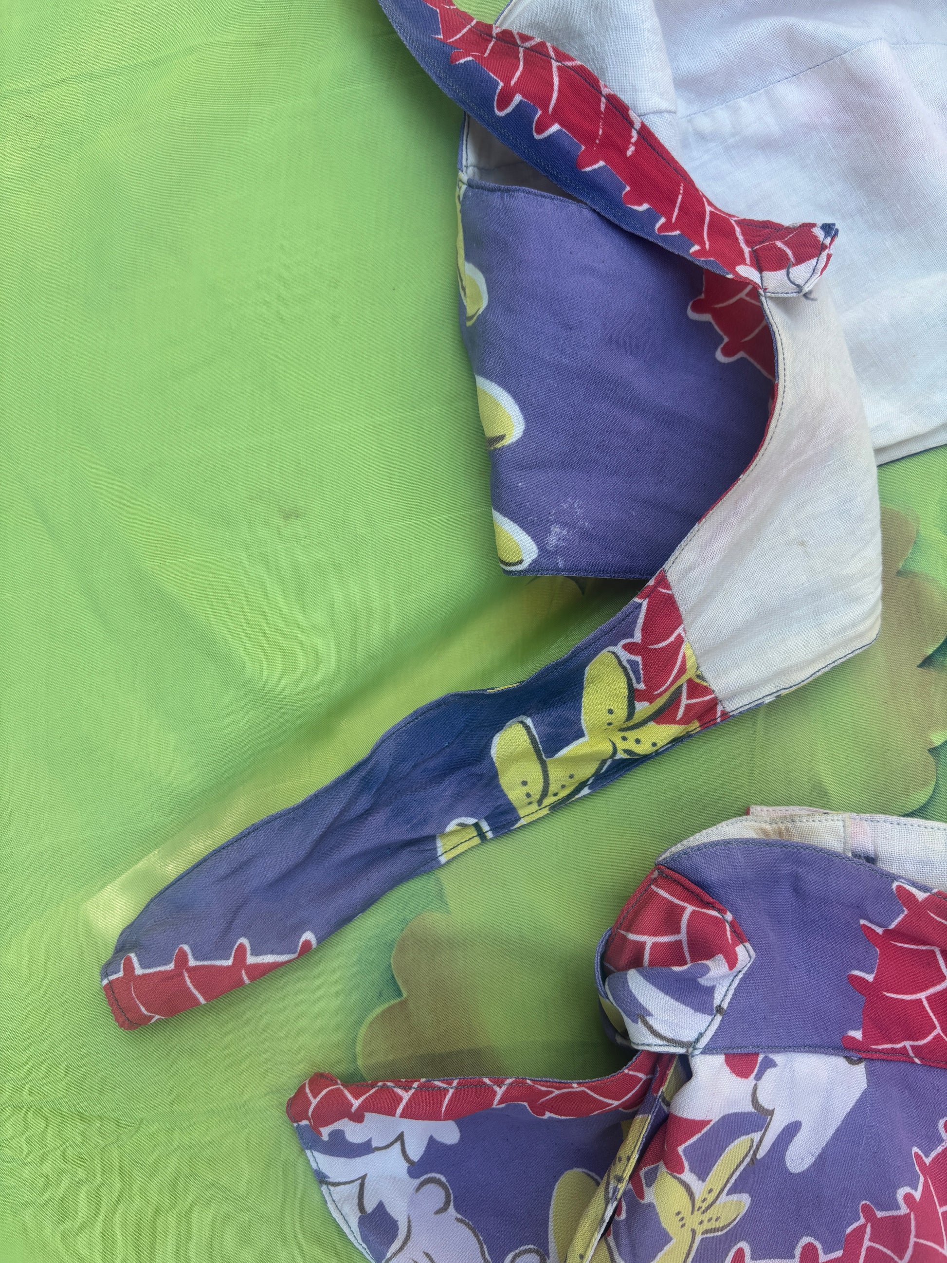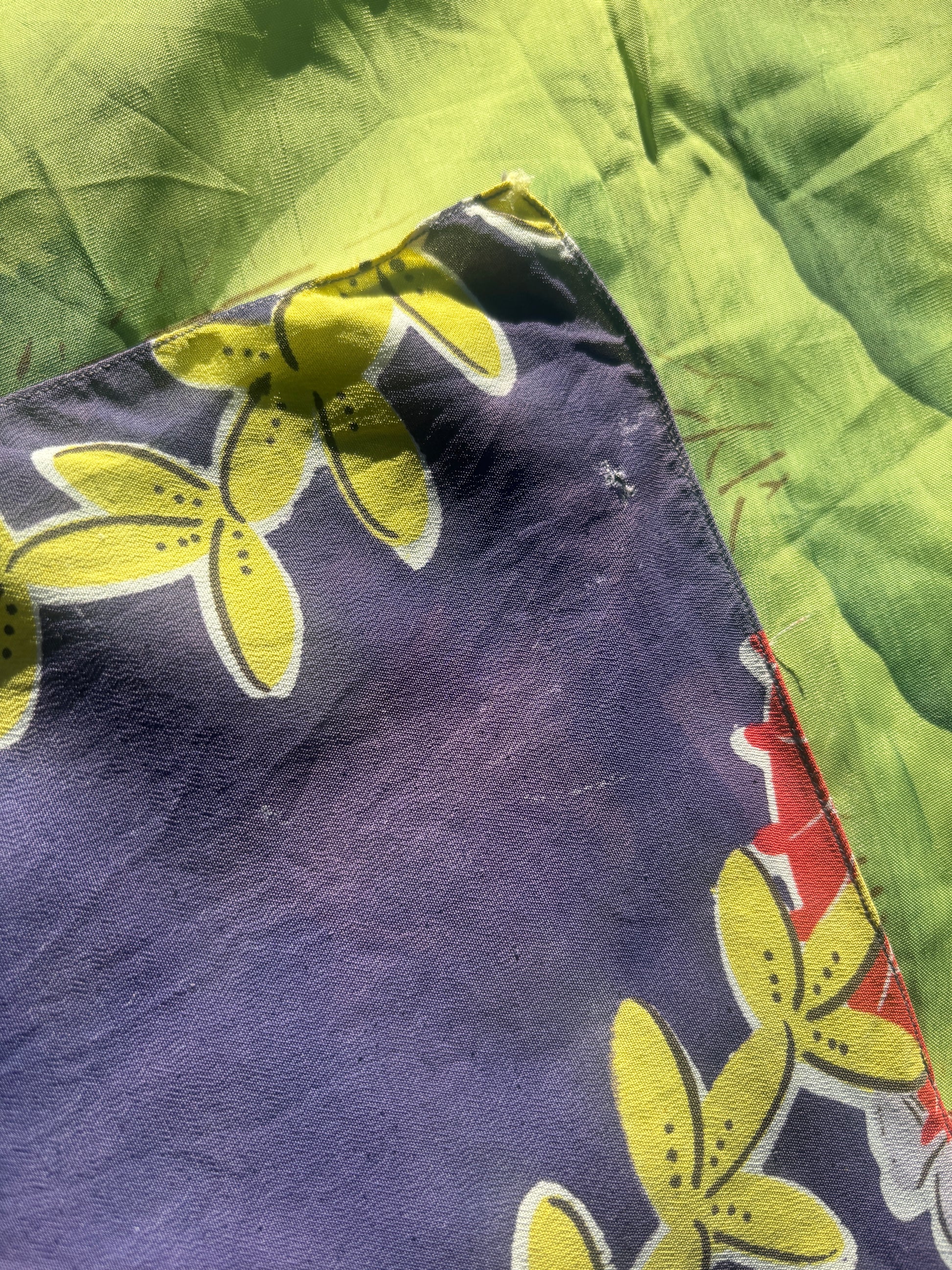 1940s 3 pc rayon playsuit with top, skort and scarf. Coconut buttons and fully lined with cotton. Beautifully faded with age, which leads to some unevenness in color. Speckling of pinholes throughout, as shown in photos. Otherwise strong and ready to wear.