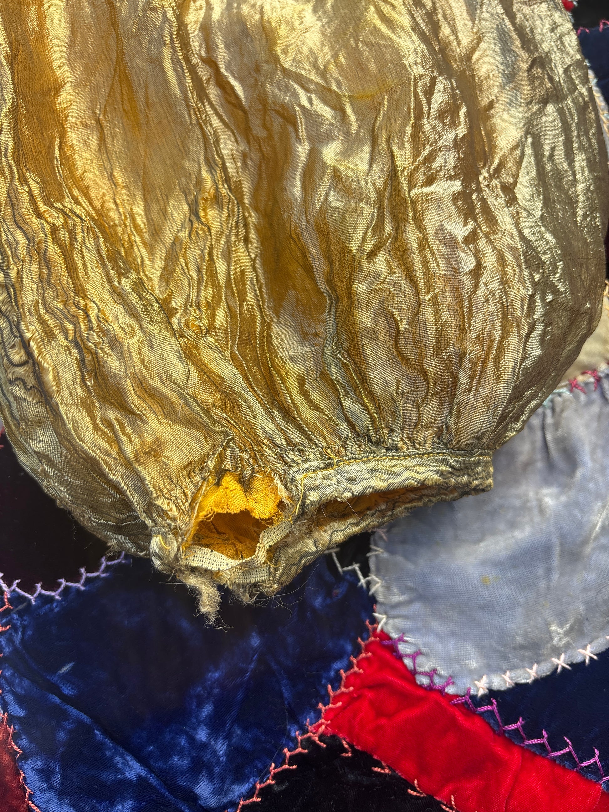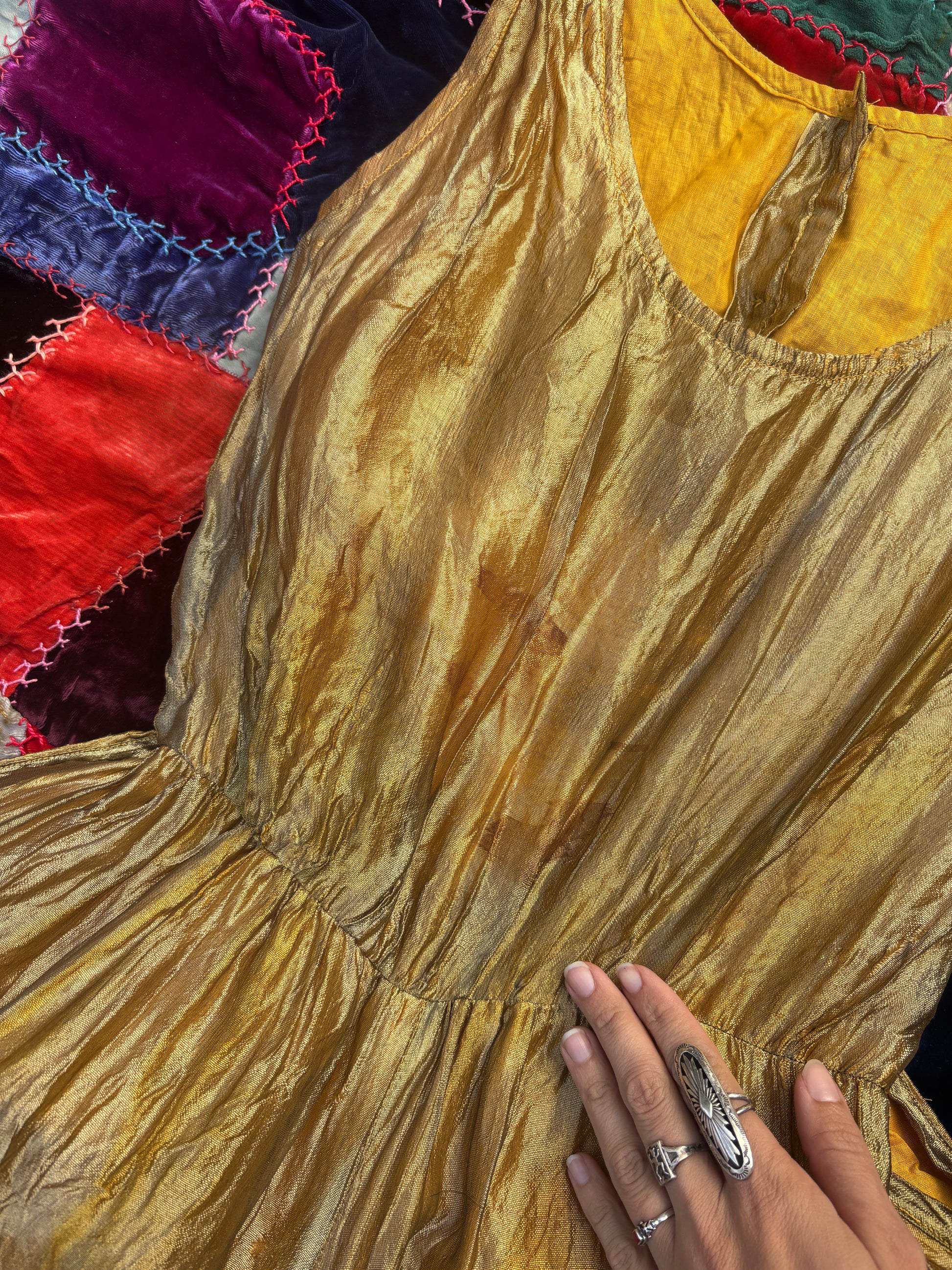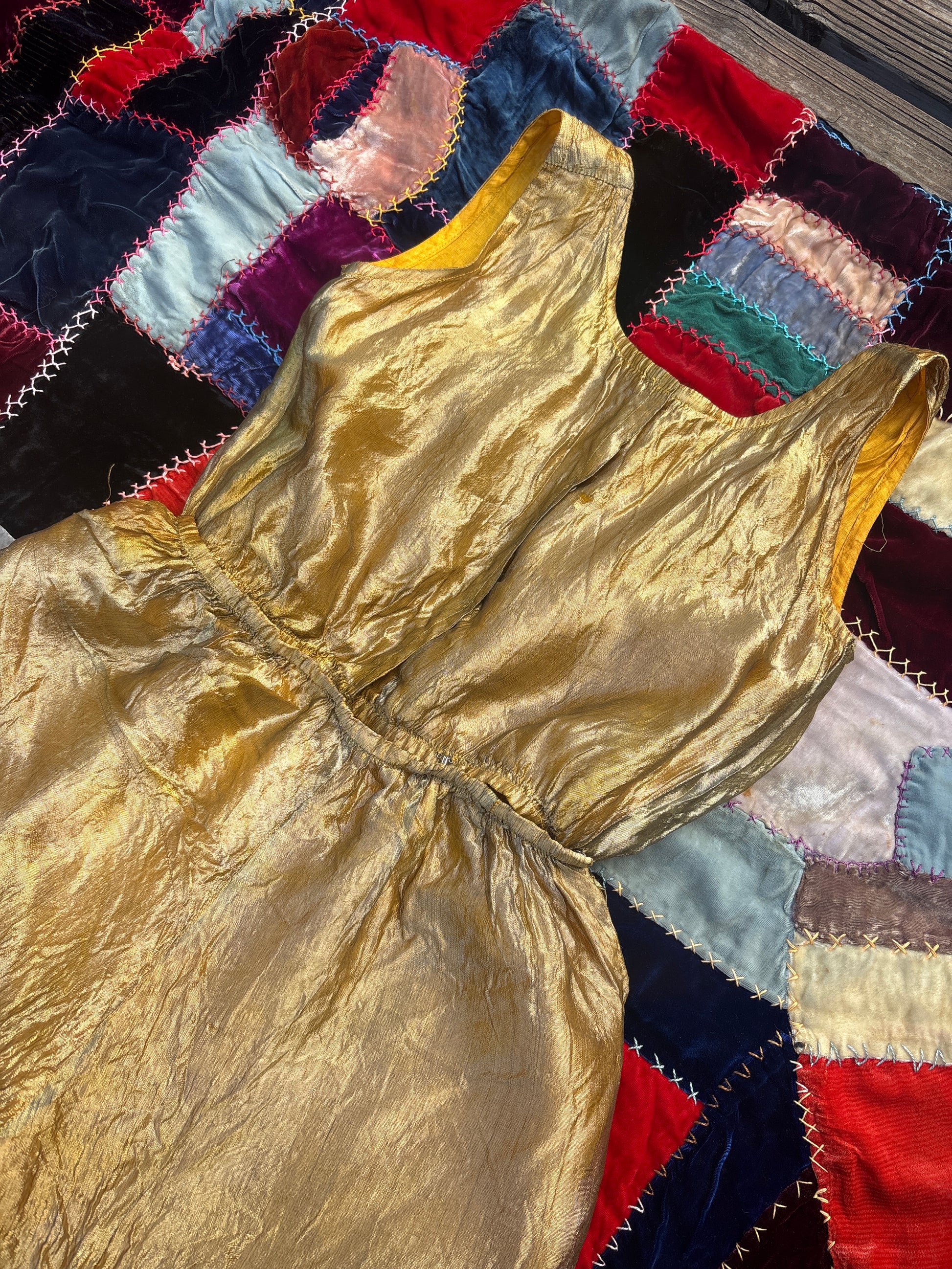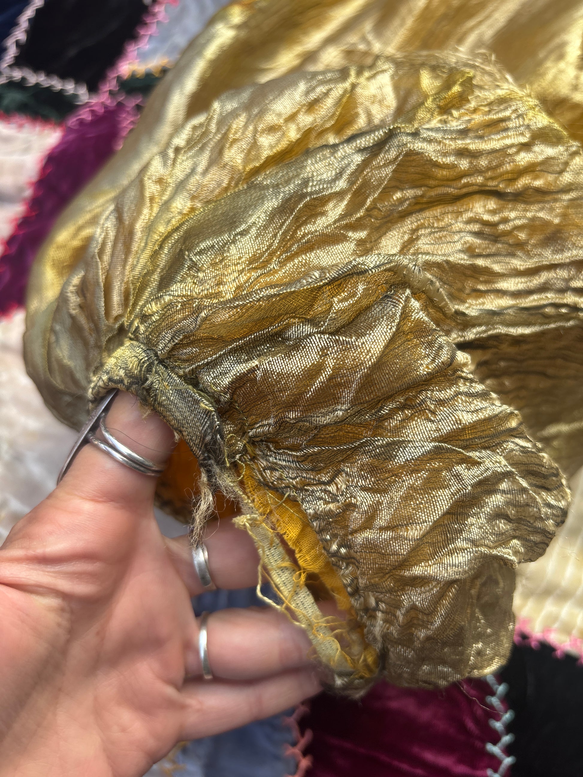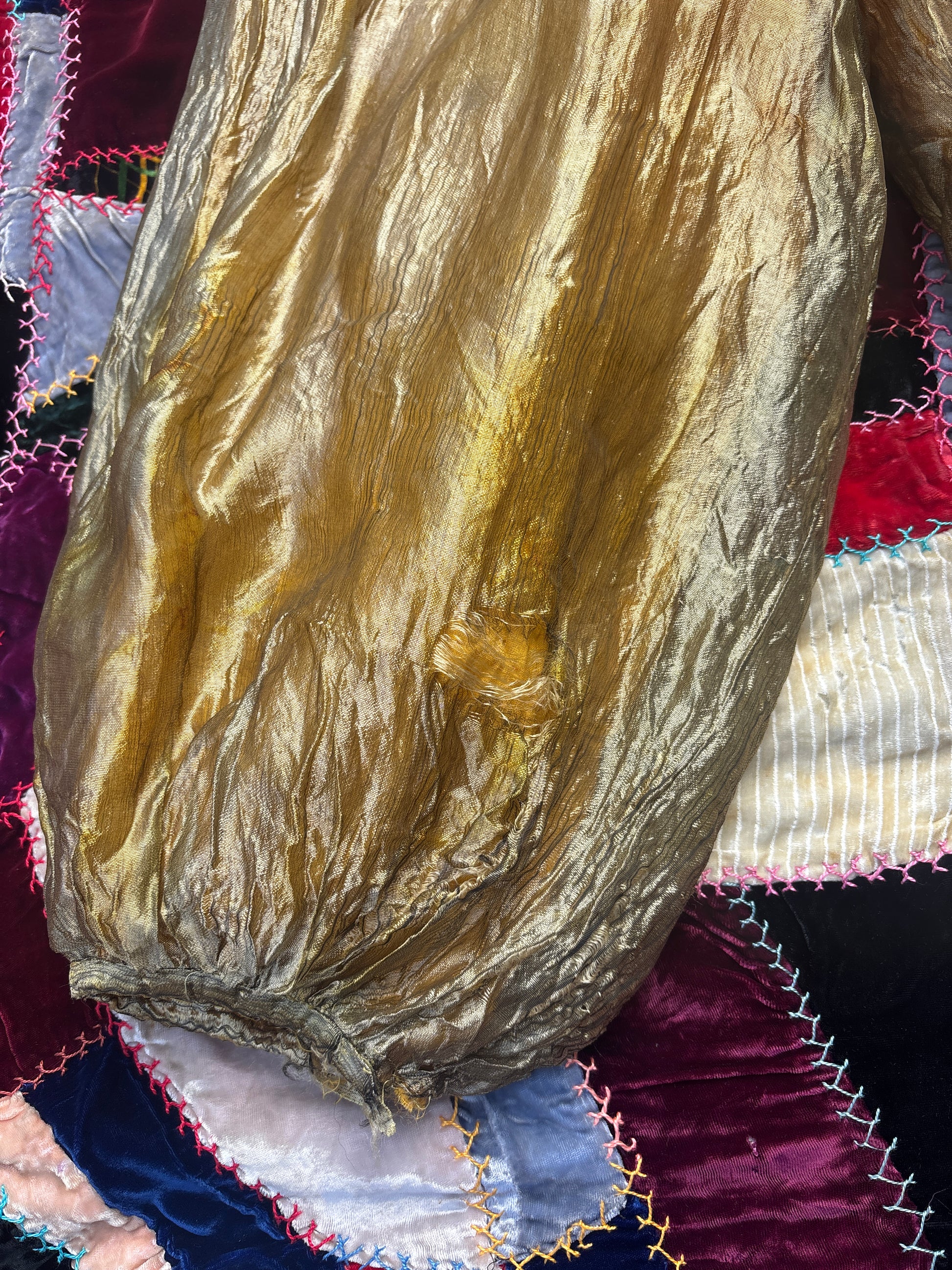 Incredible 1930s gold harem style jumpsuit, likely a genie costume. Oversized balloon legs and v shaped waistline. Lined in polished yellow cotton. Hook + eye closures down back and at waistline on back side. Has damage, there are a few tears and stains throughout. The elastic around the leg openings has no stretch. Please refer to photos.